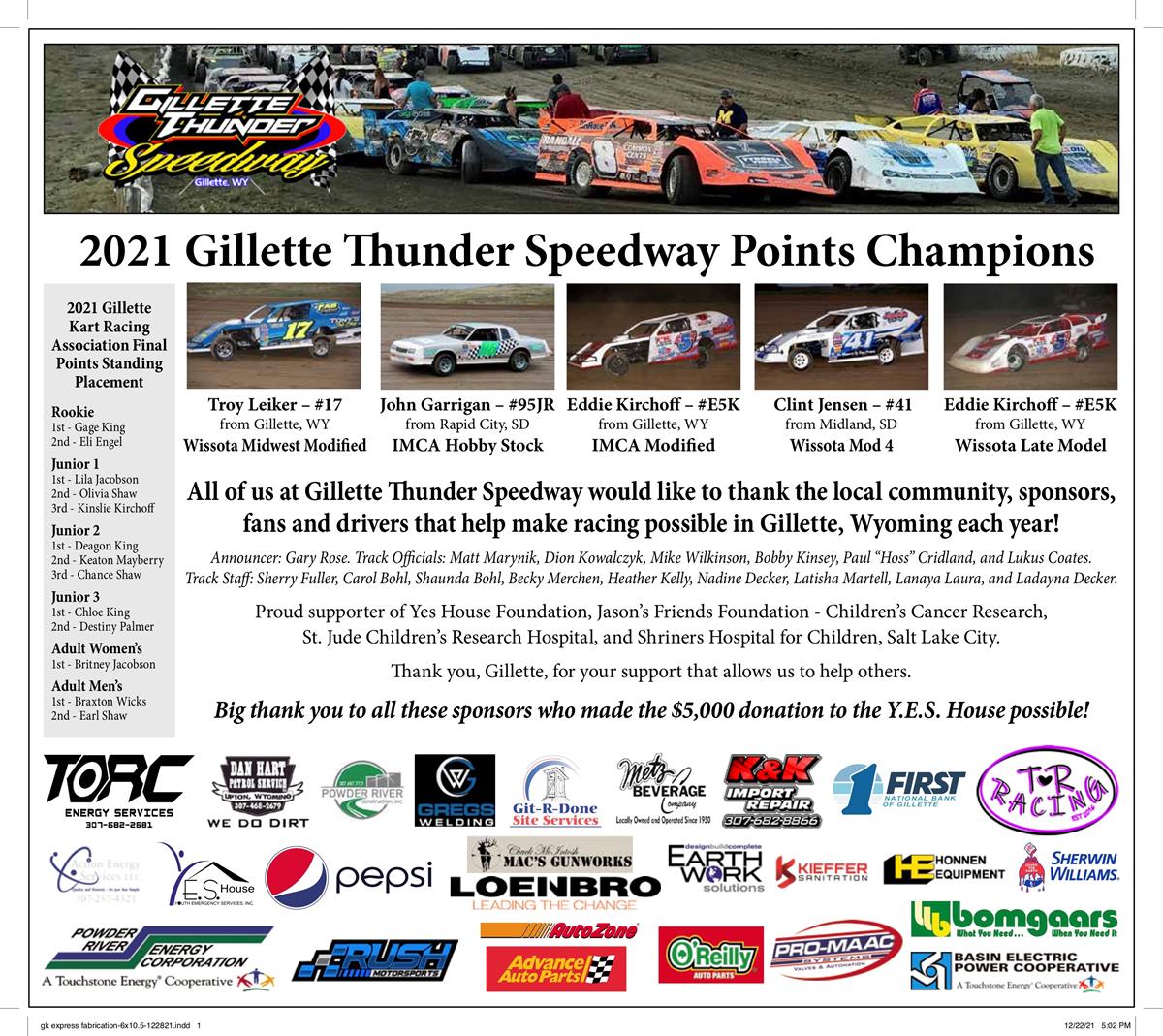 A big thank you to all the drivers, crew, fans, and volunteers for a great 2021 season! All this support makes donations like the $5,000 check to the YES House and the donation to Jason's Friends Foundation - Children's Cancer Research possible.