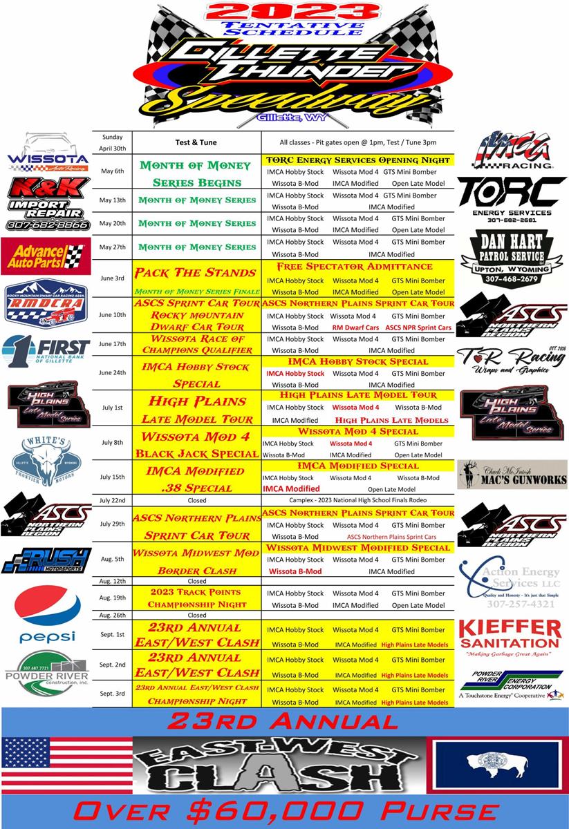 2023 Gillette Thunder Speedway Tentative Schedule. A Big thank you to all our great sponsors, spectators, drivers, crews, and GTS volunteers that help make racing possible each season at GTS! This is a tentative schedule and is subject to change. Thank you.