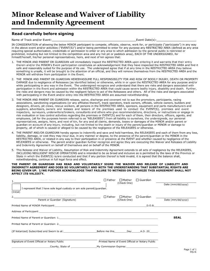 - The minor waiver can be signed each time prior to each event as long as both the parents/guardians are there to sign. This does not need to be notarized.