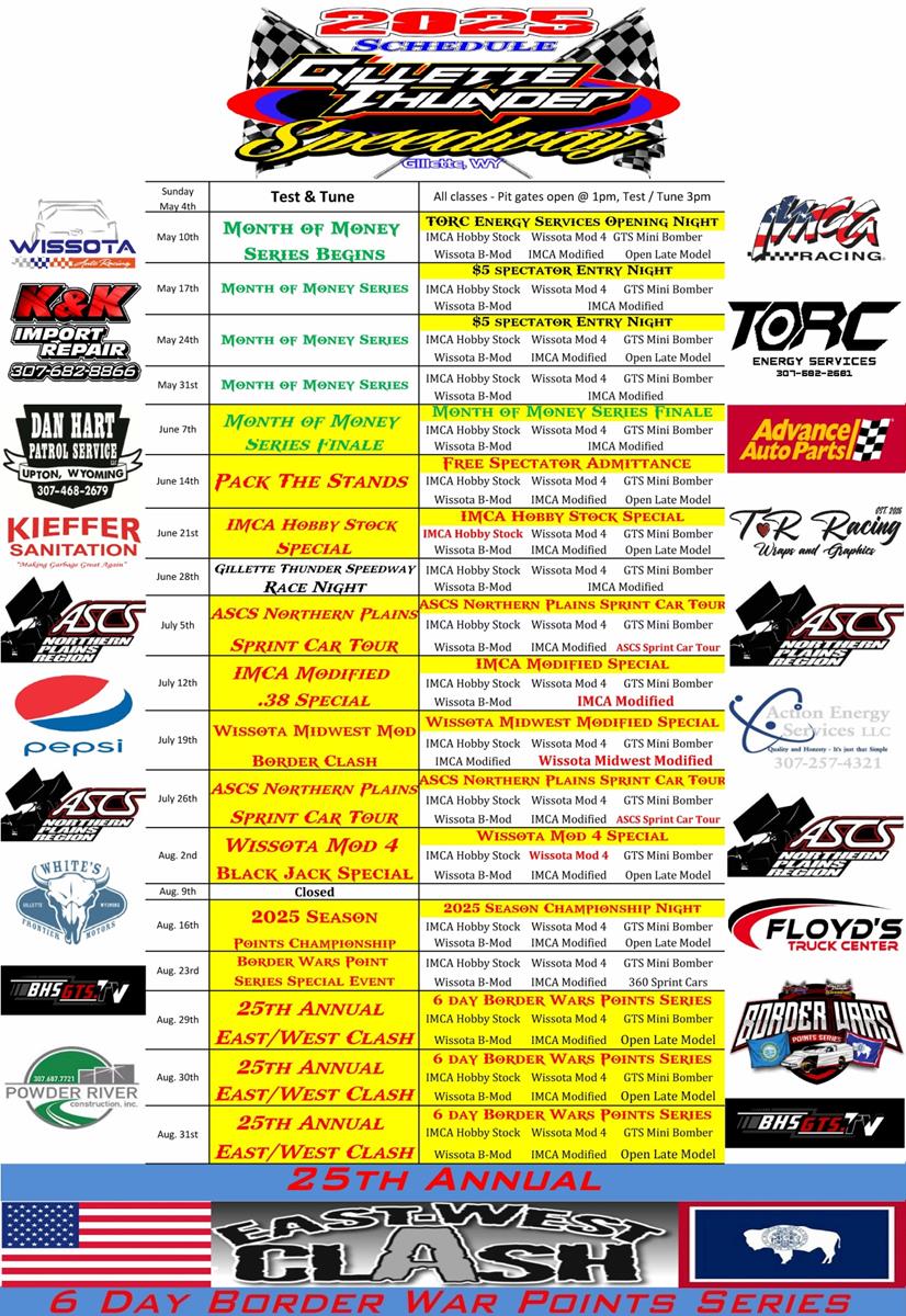 The 6 day Border Wars Points Series will begin @ Black Hills Speedway for the 8th Annual South Dakota Lottery Half Mile Nationals Thursday August 21st - Friday August 22nd. Saturday the Series comes to Gillette for August 23rd 3 day event! The Series concludes with the 25th Annual East West Clash Labor day weekend here at Gillette Speedway!