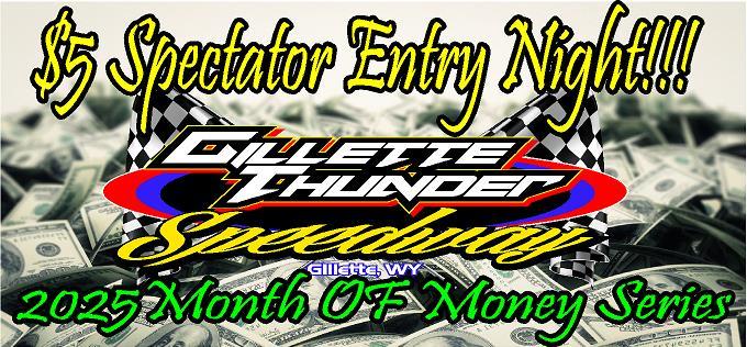 This Saturday is $5 Spectator Entry Night!! All spectators are only $5, kids under 4' are still free!! If you haven't been out to Gillette Thunder Speedway for awhile, come check out some racing action for only $5! Night 2 of the 2025 Month of Money Series continues!